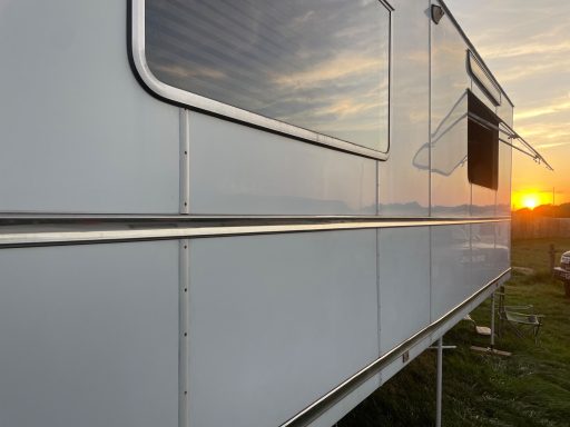 The slide outs would be pulled and set up for you. This makes the wagon over 15' wide in the kitchen and living room